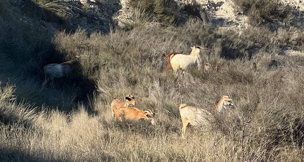 Ich winke dem Schäfer zu, der mitten zwischen seiner Herde steht, die gerade seelenruhig über mein Campo läuft. Von meinem Besuch bei der Stadtverwaltung Jumilla weiß ich, dass der Weg an dem Grundstück vorbei als offizieller Viehtrieb ausgewiesen ist. Weder die Ziegen noch der Hirte nehmen es so genau mit den Grundstücksgrenzen. Was auch immer irgendwann hier mal angebaut werden sollte, muss also von vorneherein robust genug sein, dass ab und zu mal eine Ziege dran knabbert. Spontan muss ich schmunzeln, während ich mir vorstelle, auf dem Grundstück wirklich meinen Plan eines Bildungscamps umzusetzen. Vorm inneren Auge sehe ich morgens einen Besucher aus seinem Zelt krabbeln und Aug in Aug dem furchteinflößenden Gehörn einer Ziege gegenüberzustehen.