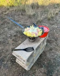 Während mein Gast sich ans Kartoffelnschälen begab und seinen Benzin-betriebenen Kocher zum Zubereiten von leckeren Bratkartoffeln anheizte, wanderte ich übers Gelände und sammelte abgestorbene Mandelbäume ein. Zwar hatte es in der Nacht zuvor heftig geregnet, doch der Kern des Holzes war durchs jahrelange Rumliegen in der Sonne absolut Brennholz-tauglich trocken. Beim Zersägen der eigentlich gar nicht mal so dicken Stämmchen bin ich ganz schön ins Schwitzen gekommen. Ich bin echt überrascht, dass Mandeln ein so unfassbar hartes Holz erzeugen.