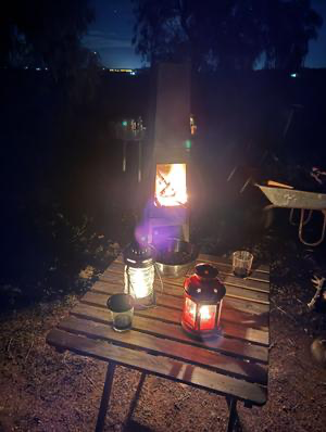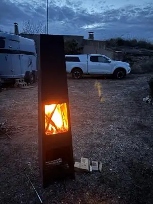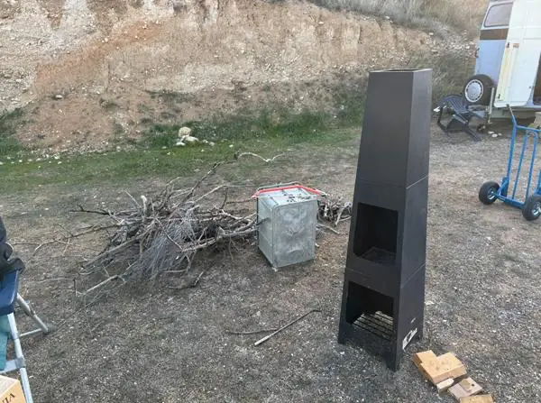 Bei einem meiner früheren Baumarkt-Besuche in Gernsheim hatte ich vor Ewigkeiten einmal eine blecherne Feuerstelle gekauft, die als Ausstellungsstück mit ein paar Kratzern erheblich runtergesetzt war. Ursprünglich damals für meinen Campingplatz in der Gernsheimer Nachbarortschaft Biebesheim als Möglichkeit zum Aufwärmen gedacht, kam das Teil jedoch nie zum Einsatz. Da ich beim Beladen des Pferdeanhängers für die Fahrt hier nach Spanien noch einiges an Volumen frei hatte und das Teil nicht wirklich viel wog, habe ich es kurzerhand mitgenommen. Für mich alleine hätte ich es vermutlich niemals in Betrieb genommen. Aber so mit einem Besucher auf dem Campo und sowohl in meinem Wohnwagen aufgrund des festen Umbaus zum Schreibtisch als auch in seinem kleinen Womo keine Möglichkeit, zum Drinnen hinsetzen, war eine Feuerstelle draußen doch eine echte Alternative.