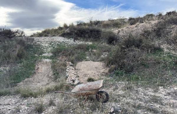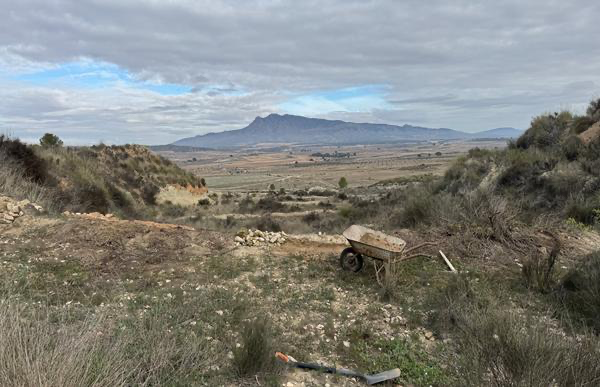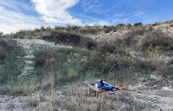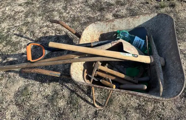 Zuerst mal ein bisschen Werkzeug zusammensuchen. Aus allen Ecken meines heimatlichen Bestandes hatte ich bis hin zu zwei Schubkarren alles Mögliche an altem Gartengerät in den Anhänger geworfen, bevor ich nach Spanien aufgebrochen bin. Einzig einen Spaten habe ich mir hier im Baumarkt neu gegönnt.