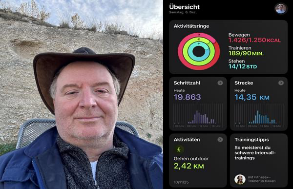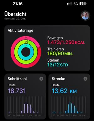 Richtig enttäuschend ist es jedoch zu sehen, dass mein kleiner Beobachter am Handgelenk der Meinung ist, ich hätte trotz all der Plackerei mein Tagespensum an Kalorienverbrauch und Zeit im Stehen noch nicht erfüllt. Nur der mittlere Kreis des Trainings ist vollständig erbracht. Nun, mir langte es auf jeden Fall für den Tag, für das Wochenende, ja, für die ganze Woche.