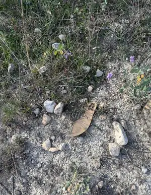 Schon hinter meinem aktuellen Stellplatz habe ich im Gebüsch einige alte Schuhsohlen gefunden. Insgesamt liegt auf dem neuen Platz tatsächlich recht wenig, ja fast überhaupt kein Unrat als Zeugnis früherer menschlicher Nutzung. Doch Schuhsohlen finde ich auch hier zwischen all dem Gestrüpp. Und eindeutig handelt es sich hierbei nicht um das Unterteil eines Schuhs, den man zum Begehen solch eines Terrains tragen würde.