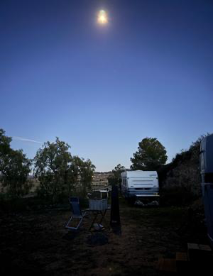 Immer noch eher ein Suchbild? Nun, dann nutze ich mal den Zoom des iPhones, um der Suche ein Ende zu bereiten. Rechts oben sieht man nun meinen Wohnwagen hinter den beiden Pfefferbäumen und noch ein bisschen weiter rechts daneben den grauen Pferdeanhänger.