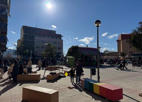 Ob nun Dorf oder Stadt, in Spanien ist es üblich, dass man sich irgendwo einfach trifft und plaudernd stehen bleibt. In Fußgängerzonen eine Qual für diejenigen, die da einfach nur durchlaufen wollen. Aber seitens der Stadtplaner werden daher seit je her alle paar Häuserblocks freie Flächen eingeplant. In den meisten Fällen gleich kombiniert mit irgendwelchen Beschäftigungsmöglichkeiten für die Kinder. Irgendwie fühlt sich das alles rundherum locker und ungezwungen an. Aufgrund meines vollen Schreibtisches und meines die Kräfte eines einzelnen Menschen völlig übersteigenden Stellplatz-Einricht-Plans des Campos bin ich mental selbst nach inzwischen fünf Wochen in diesem Land immer noch im ziemlich deutschen Zustand des Ständig-Getriebenen. Doch man spürt richtig, wie die innere Uhr langsamer zu laufen beginnt, wenn man sich auf so einem Platz einfach nur in der Sonne dazu stellt und die Menschen beobachtet.