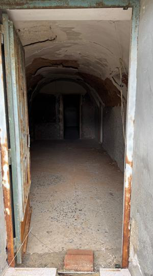 Zur Haupteingangstür habe ich selbst überhaupt keinen Schlüssel, ich muss immer durch einen Seiteneingang reinschlüpfen. Als der Vertreter des Miteigentümers einmal hier war und das Hauptportal aufschloss, konnte ich ein schönes Foto in die Tiefen der unterirdischen Grabungsergebnisse werfen. Und wie man der Decke auch schon aus diesem Blickwinkel ansieht, hat es hier und da schon ein bisschen Putz herunterrieseln lassen. Zugegeben, ausnahmslos nur den Putz, den man vor zig Jahrzehnten einmal darauf gekleistert hatte. Aber besagter Putz blieb beim Runterfallen ja am Stück. Die direkte Schicht darunter war es, die im Laufe der Zeit nachgab.