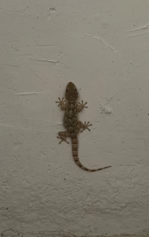 Während meiner Kabelverlegearbeiten ist mir auch Mr. Gee wieder begegnet. Ich hatte ihn schon vermisst. Als ich im Sommer vor der brüllenden Sonne flüchtete und mich mit meinem Computer im vorderen Teil der Höhle breit machte, krabbelte der Gecko immer mal wieder an der Wand hinter meinen Monitoren herum. Mangels anderer Gesprächspartner habe ich das Tier dermaßen zugetextet, dass ich bei meiner Abreise sicher war, er versteht inzwischen Deutsch. |