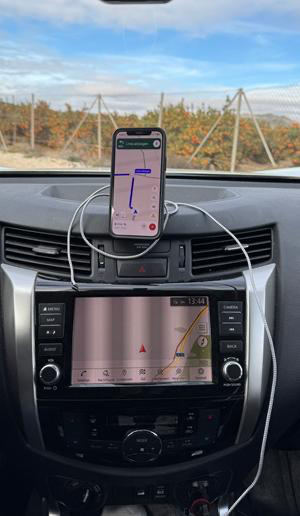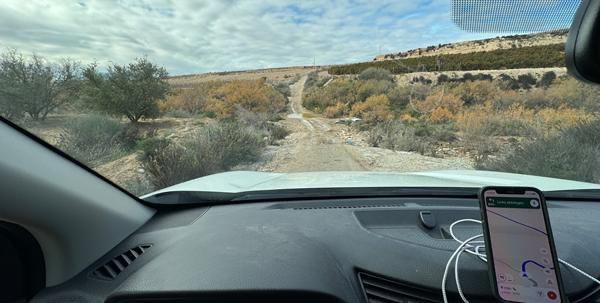 Ich weiß nicht, was das Navi denn reitet, mich jedes Mal im Adventure-Modus durch die Gegend zu leiten. Wieder einmal durfte ich durch eine Rambla fahren, dieses Mal führte diese aufgrund des Regens am Vormittag sogar Wasser. Jetzt hoffe ich selbst auf baldigen erneuten Regen, denn mein Auto sieht nun aus wie Sau. Wenn mir das nochmal passiert, muss ich die Einstellungen der Wegleitungen einmal überprüfen, ob man da irgendwo einen Haken setzen muss in Sachen „bitte Feldwege vermeiden und nur für normale Autos geeignete Straßen nutzen“. Vor allem: Man beachte die Angabe auf dem Handy-Display! Google ist bei seiner Reiseberechnung ernsthaft der Meinung, ich könne diese Furt in der Senke vor mir locker mit 90 km/h passieren.