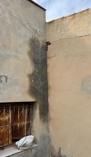 Der Putz außen an der Wand lässt einen deutlichen Rückschluss zu, wo sich denn die meisten Wassermengen ins Innere bewegen. Genau die Ecke, an der das ganze von der Frontmauer gestoppte Wasser abbiegen muss zum Abfließen.