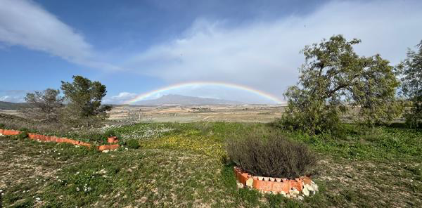 Regen bringt manchmal auch noch etwas anderes zum Vorschein als nur Pflanzen, daher gibt es hier zum Abschluss noch einmal genau diese grüne Wiese vor meiner Tür, jetzt aber mit einem Bogen über der Sierra del Carche, bei dessen Anblick mein Zorn übers viele Drinnen-bleiben-Müssen dann doch ganz schnell wieder verfliegt.