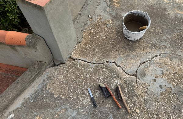 Doch eine andere Stelle des potenziellen Wassereintritts konnte ich in dem Bereich gar nicht ausmachen. Ich habe mir einen halben Eimer Zement mit Sand angerührt und mich mit meinen ungeübten Buchhalterfingern ans Vollstopfen der Löcher gemacht.