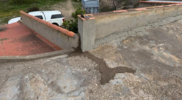 Der Beton rund um die geflickte Stelle wirkt insgesamt auch schon ziemlich porös. Ende der kommenden Woche muss ich aus anderen Gründen mal wieder in den Baumarkt fahren. Mal schauen, was hier in Spanien ein Sack Fließspachtel kostet. Bitumen wäre vermutlich die bessere Lösung, aber ich will ja nur eine Behelfsabdichtung herstellen, bis die Zukunft der Höhle insgesamt geklärt ist. Dann kann man immer noch schauen, was man hier an zusätzlichem Material aufbringt.