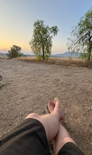 Jedenfalls habe ich auf der Suche nach einem Foto des von mir damals entwilderten Hofes vor meinem Wohnwagen nur diese Aufnahme des Abendrotes ausfindig machen können. Man sieht rechts die hier Laub tragende, aus einem mehrfach umgebrochenen Baumstamm gewachsene Feige. Und kann links daneben vor der Auffahrt des Grundstückes ein bisschen den nur aus Sand bestehenden Weg erkennen.